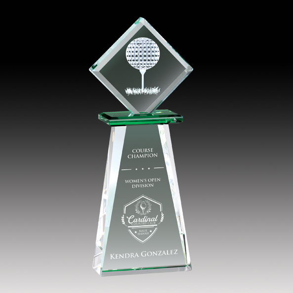 Celebrate exceptional golfing achievements with our monumental 3-D Golf Ball Crystal Award. The intricate design features a 3-D golf ball atop a green accented base, with space for a personalized etched message on the large base.‚ This item is available in 2 sizes, standing tall at 8" or 9.5" perfect for corporate events or charitable outings. Impress with this sophisticated and exclusive award.