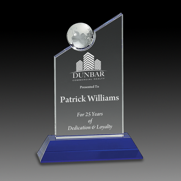 This award is perfect for recognizing global reach. The elegant award, made of clear crystal with an inset crystal globe, is presented on a blue base. This award is out of this world!
