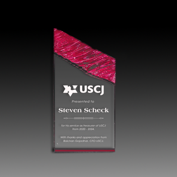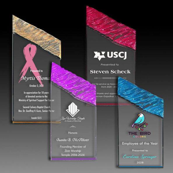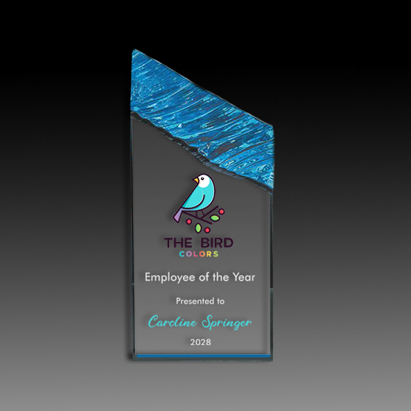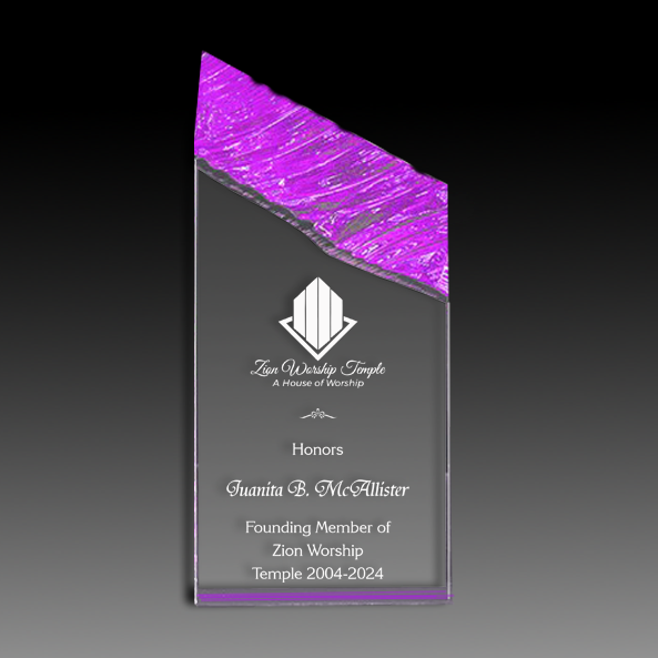 This peaked, carved acrylic trophy is available in 4 stunning colors and has a beautiful presentation that will highlight the recipient's accomplishments. Beautifully cut and highlighted, it proudly recognizes an achiever for all their accomplishments. Available in 2 sizes and 4 colors: Blue, Gold, Red, and Purple.