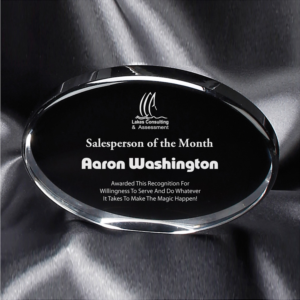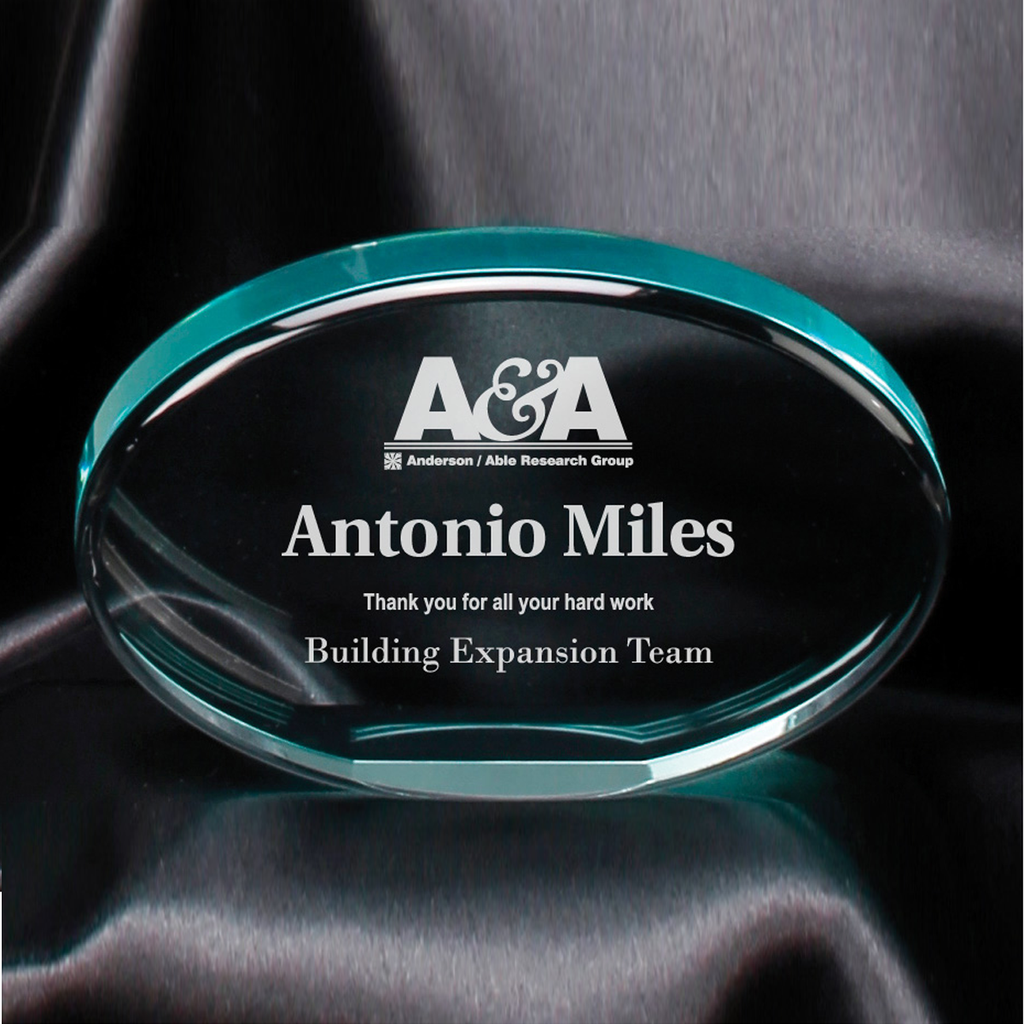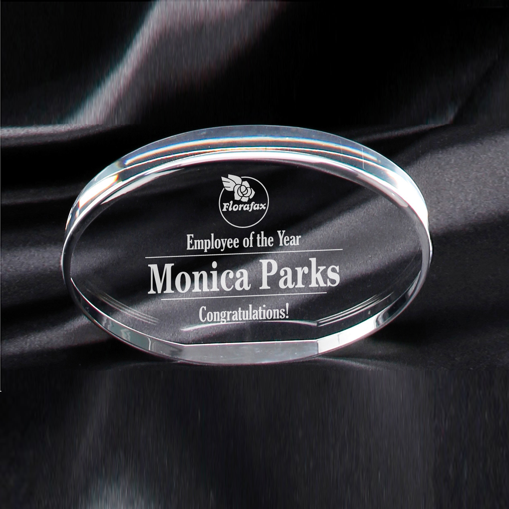 This beautiful acrylic oval award creates interest and depth. We offer this award in three different colors. You can personalize this award with any logo, message or image. This award would be a great way to acknowledge someone's milestones. Add some sparkle to someone's office or home.