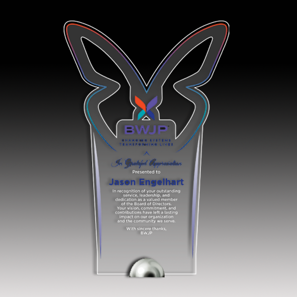 Crafted with a sleek chrome metal base and clear 3/8" acrylic, this customizable award offers a sophisticated presentation perfect for recognizing excellence. Available in three sizes, it provides versatile display options tailored to your needs, combining durability with modern elegance for a distinguished tribute.
