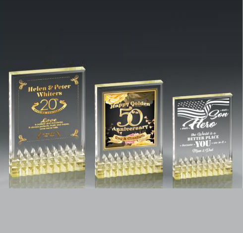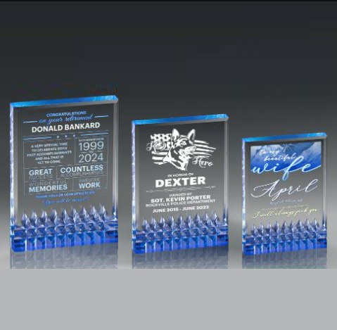 This acrylic is beautiful with the colorful jewel cuts across the bottom. If you are looking to shine a spotlight on and recognize your best achievers, this is the trophy for you. Available in 3 sizes and 4 colors: Blue, Gold, Red, and Purple.