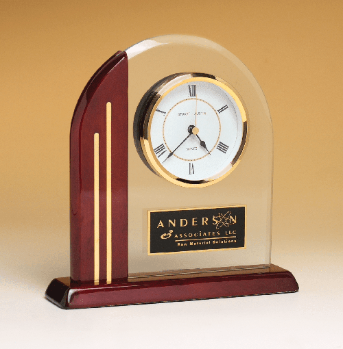 Arched clock with glass upright and rosewood piano-finish post and base. Clock supplied with lifetime guaranteed quartz movement. Laser engravable plate(s). Solid brass engraving plate(s). Individually boxed. Batteries Included. 7.5 x 7.875
