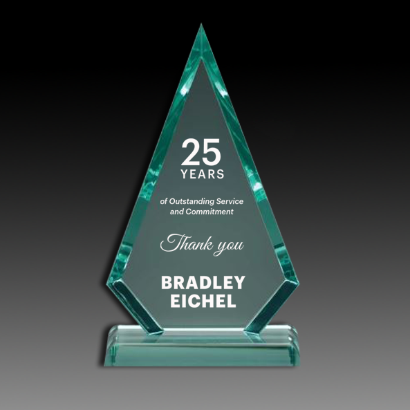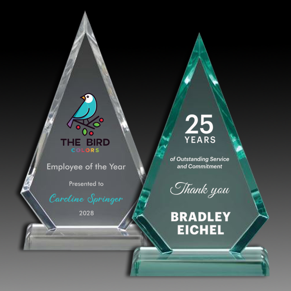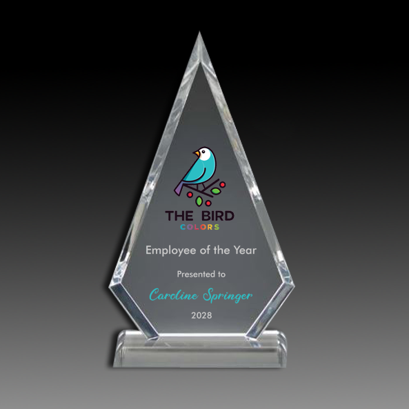 This arrowhead acrylic award on a clear base is beautifully finished and it says it all in a glance. It goes well in any office setting. This product will highlight a room while displaying your choice of text and company's name. Make someone happy with this elegant award. Available in 2 colors and 3 sizes.