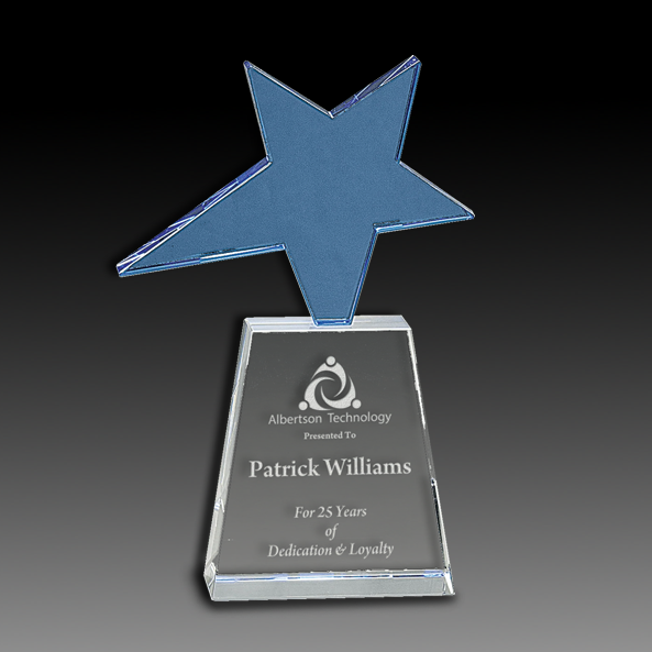 This blue star stands atop of a clear crystal base, making a splendid presentation. The base provides the perfect backdrop for your text and logo. Let someone know they are a rising star.