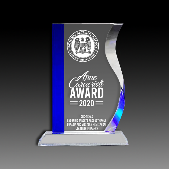 This combination of the clear crystal wave is fused with the optically blue crystal accent to add dimension to this brilliantly hand-crafted award. Etched to perfection.