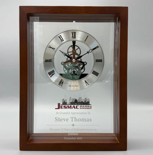 Solid ash hardwood case is finished in a walnut stain. The silver chapter ring is diamond cut with Roman numerals and surrounds the working “floating” Skeleton movement with metal gears, metal filagree hands and functioning seconds subdial above the 6 position. This clock can either be hung on a wall or used as a bookcase/credenza accent. Unique design allows the front protective lens to be removed easily to be decorated/engraved then re-inserted offering a large area for artwork or a message.