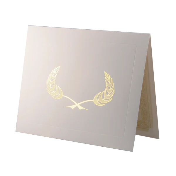 Our White Folder is Die cut to hold either 8" x 10" or 8 1/2" x 11" certificates with Gold Achievement Wreath on the front cover. The overall one-piece construction provides a classy presentation at a minimal cost.