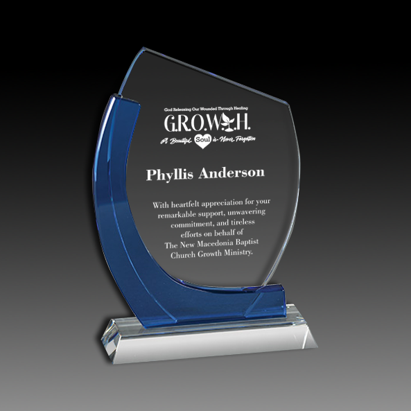 The Chesapeake crystal award with it's curves and blue accents is absolutely elegant. The crystal award sits atop of a matching clear base. It is available in 2 sizes, both with ample space for your message and logo.