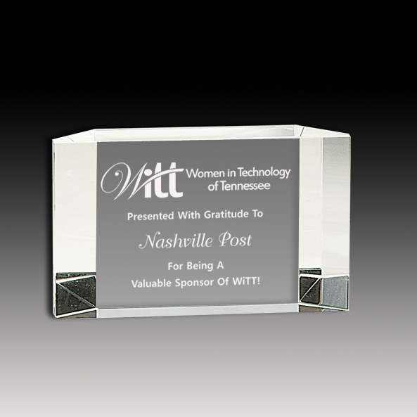 This freestanding crystal block is magnificent and would look stunning in any setting. You can customize this award with your logo and choice of text. It is available in three sizes.