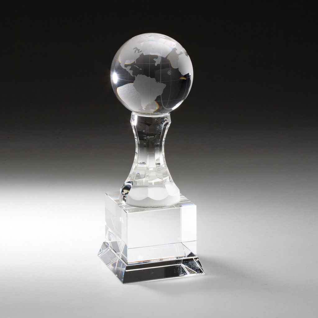 This 9"H award is perfect for recognizing global reach. The elegant award, made of clear crystal, is perched beautifully on a crystal stem. The combination gives us a heavy award and is out of this world. A well-built gift box is included.