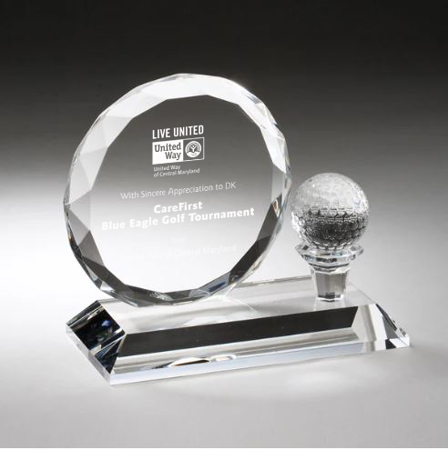 Introducing our Crystal Golf Ball and Faceted Circle award, perfect for recognizing achievements in the golf industry. Made of high-quality crystal, it features a unique faceted design and measures 6" x 5¼", making it a stunning addition to any trophy collection. Celebrate success on the green with this exquisite award.