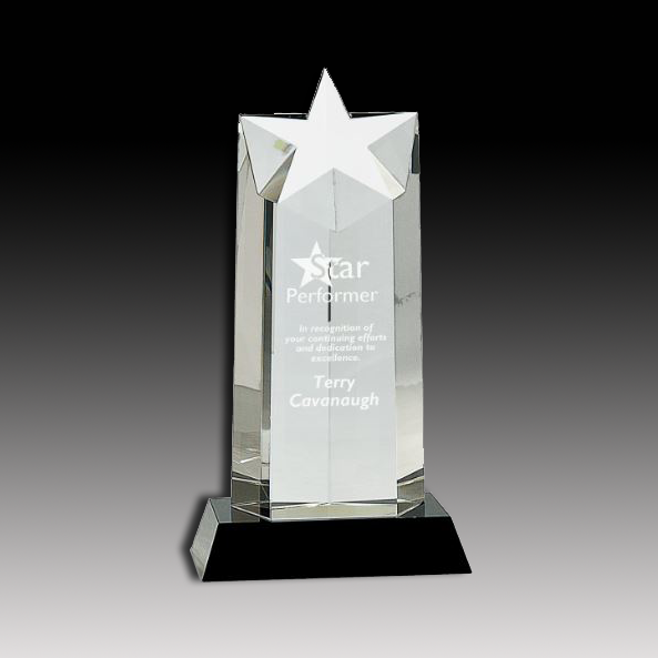 The leaders among us show us the way as they ascend to the top. This towering Crystal Star sits high atop this black pedestal base with a large front panel for optimum space to recognize out-of-this-world achievements. Available in 2 sizes.