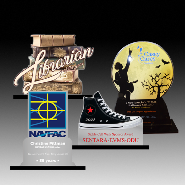 The idea of creating your own award sounds fun! With this award you get a custom cut acrylic piece to fit your theme. There is no limit to the shape or color of the acrylic piece. Highlight someone's achievements, special moments or even use it as a centerpiece on your event tables. We can create any shape. Let your imagination run wild. A $50 shape set up charge applies.