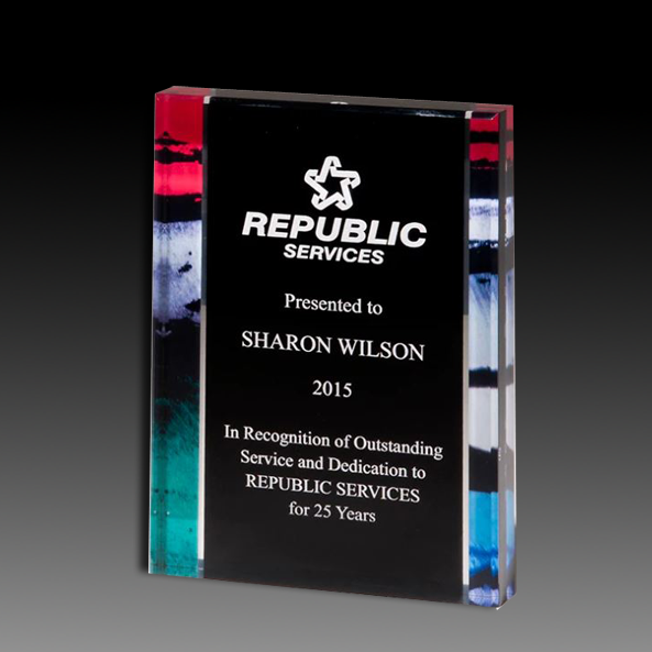 Premium Series acrylic with printed stained glass pattern border, silver mirror highlights with black center. 1" thick freestanding acrylic. Individually gift boxed.