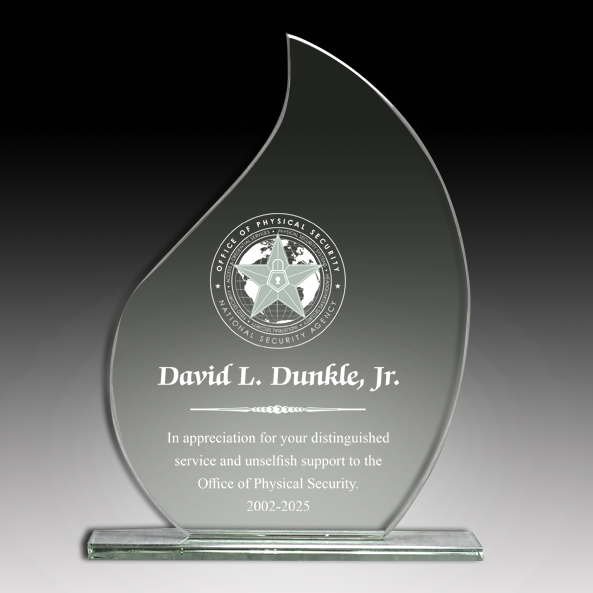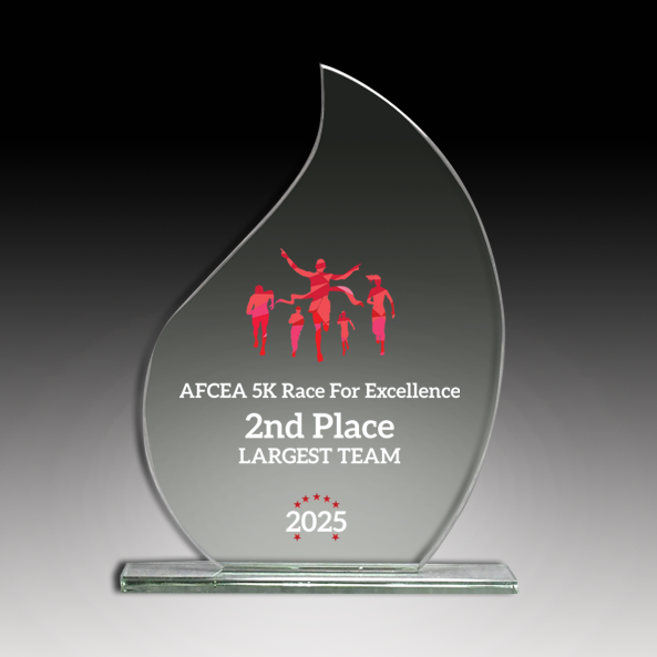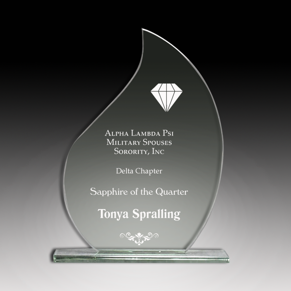 The flame award is made of jade glass and is HOT!! The finished product comes mounted on a matching base. Available in three sizes, it is perfect for tiered recognition programs. The large imprint surface allows you to include a logo, a quote, and a personal message reproduced with a variety of imprinting methods.