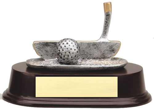 Score a hole-in-one with our 3.5" tall Golf Putter Award! This carefully detailed resin putter and golf ball award is the perfect addition to any kid's miniature putting contest or corporate golf outing Longest Putt Contest. It comes mounted on a handsome cherry-finished base and includes a personalized plate. Swing into victory with this quirky and fun award!
