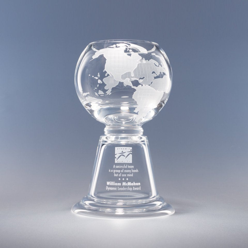Our Grande Planet will surely bring excitement to your upcoming event. Mouth-blown and hand-cut, each globe is perched beautifully upon its well-proportioned base affording plenty of room for your inscription.