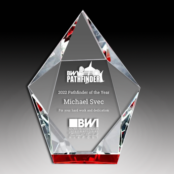 This 1.75-inch thick, clear and red, multi-faceted hexagon award is SURE to thrill your recipient! This corporate award is made of clear crystal features with a ruby red base. Available in 3 sizes.