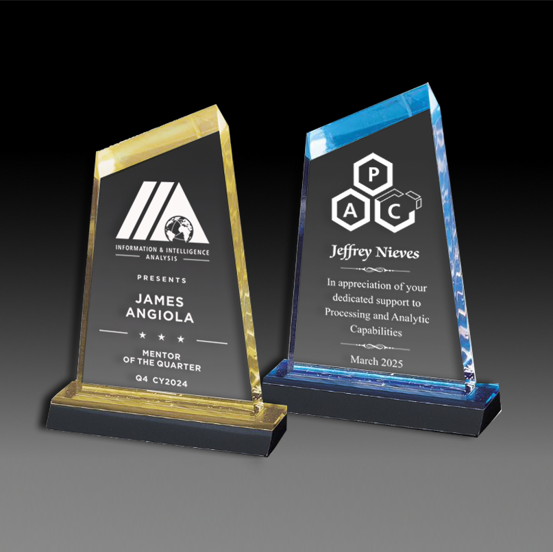 This peak top acrylic award is available with blue or gold mirrored accents. It's simple yet elegant and it will highlight any achievement. This product will look beautiful in any setting and can hold your message and graphics with its ample engraving area.