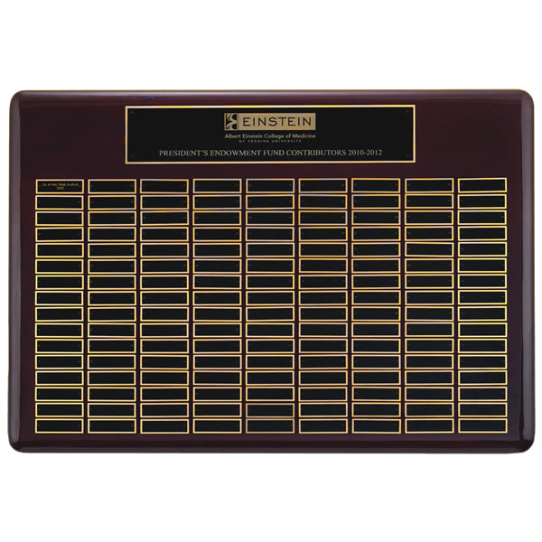 There's no denying this Perpetual Rosewood Piano Finish Plaque with 144 Plates demands attention. The massive 22x30 Rosewood Piano Finish Plaque contributes a glossy, rich red tone, beautifully contrasting with the elegant black brass plates. The many-columned, horizontal orientation allows numerous categories of recognition, each in its own column. Most recognition projects can be accommodated with this colossal plaque.