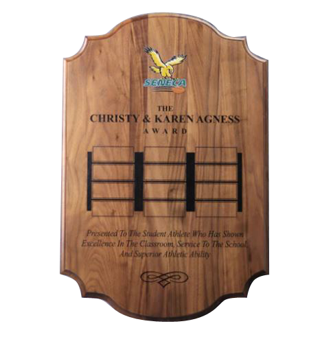 Solid walnut is a traditional recognition award. Add laser engraving and full-color imprinting directly on this beautiful high-end perpetual award for a modern design. Future plate locations are expertly laser engraved into the walnut to assure perfect alignment of all individual plates.