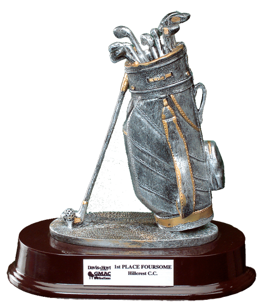 Celebrate golf success with the tools of the trade, a golf bag and clubs. Hand-crafted, 7 inch pewter-finished resin figurine with gold highlights provides something completely different for your upcoming golf event. The lifelike golf bag with clubs is set on an elegant mahogany base with a personalization plate. One of our Best Selling golf awards.