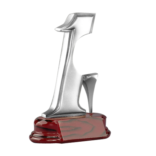 A beautiful resin statue to celebrate the ultimate achievement in golf, the Hole-In-One. This 7-inch tall Number 1 has a hole offset over a golf tee. The tee holds the ball used in the winning shot. The award has a pewter finish on a mahogany base. They include a plate for the details of the fabulous event.