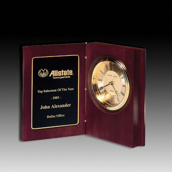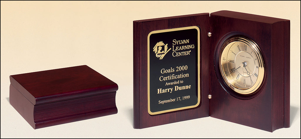 The Rosewood Book Clock is a hinged award or gift clock in presentation book form featuring a quality rosewood finish. The right side holds a beautiful quartz battery-operated clock with a gold bezel, two-tone dial with black Roman numerals, black hour and minute hands, and a gold seconds hand. The left side of the book design has a classic brass inlaid plate that can be laser engraved with your unique message, company logo, and the individual's name.