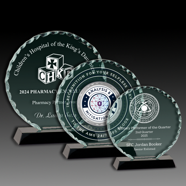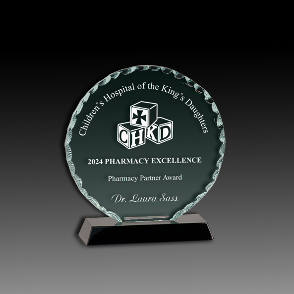 Our Round Glass Award on a black base is a simple yet classy design. The round shape provides a perfect backdrop to etch circular images or designs. Etched graphics such as a basketball or baseball are perfect ways to provide a high-end prestigious sports award. Three sizes are available for your programs.