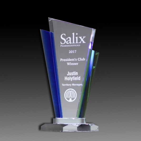 This Slant Top Crystal with Blue & Green Accents is a great award for any occasion. Its unique design and beautiful colors make it a standout piece. Take advantage of this closeout deal and make it your next web special. Order now before it's gone!