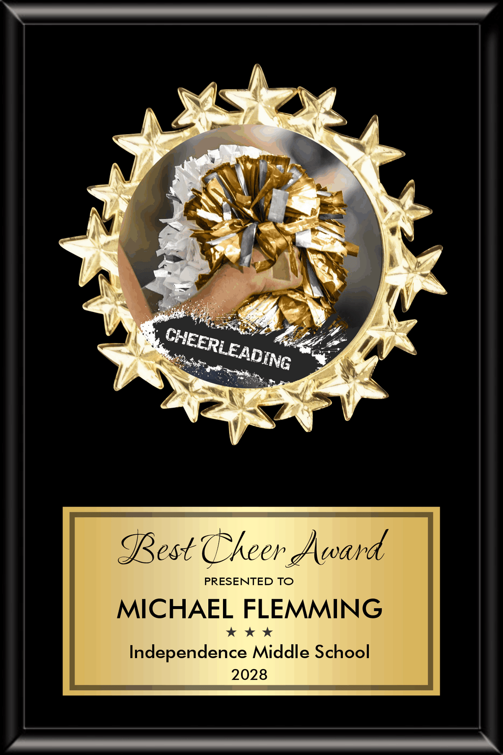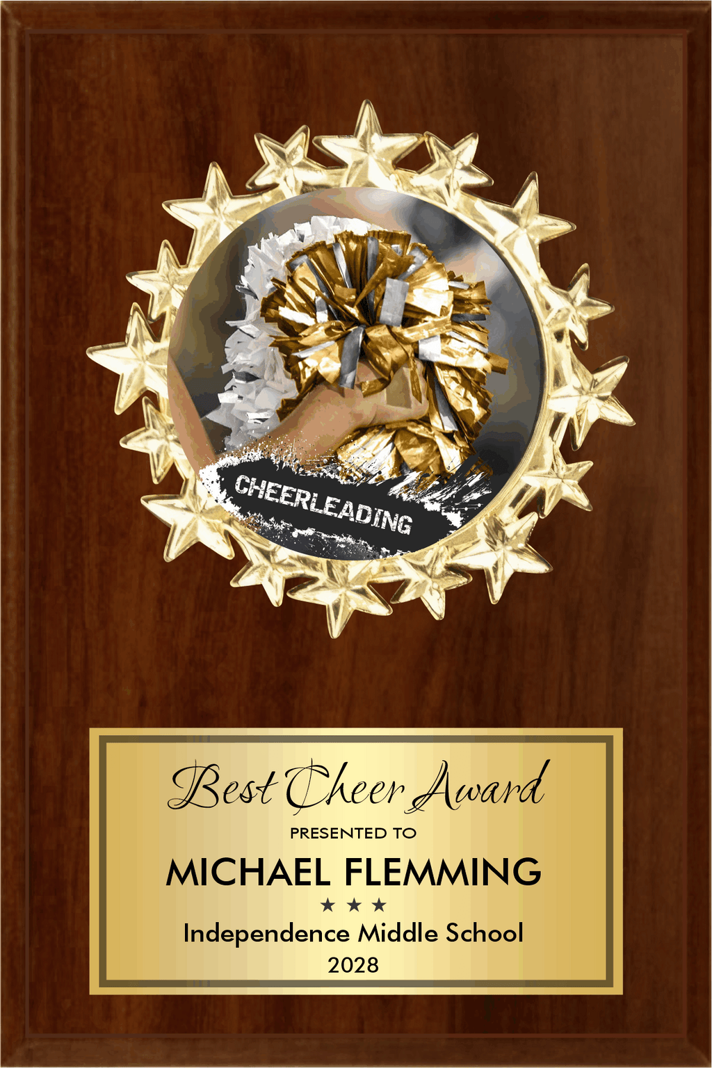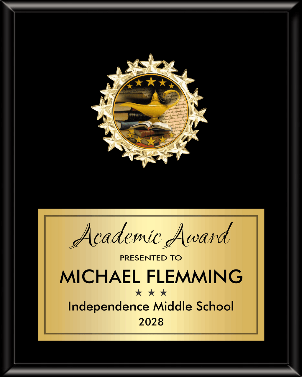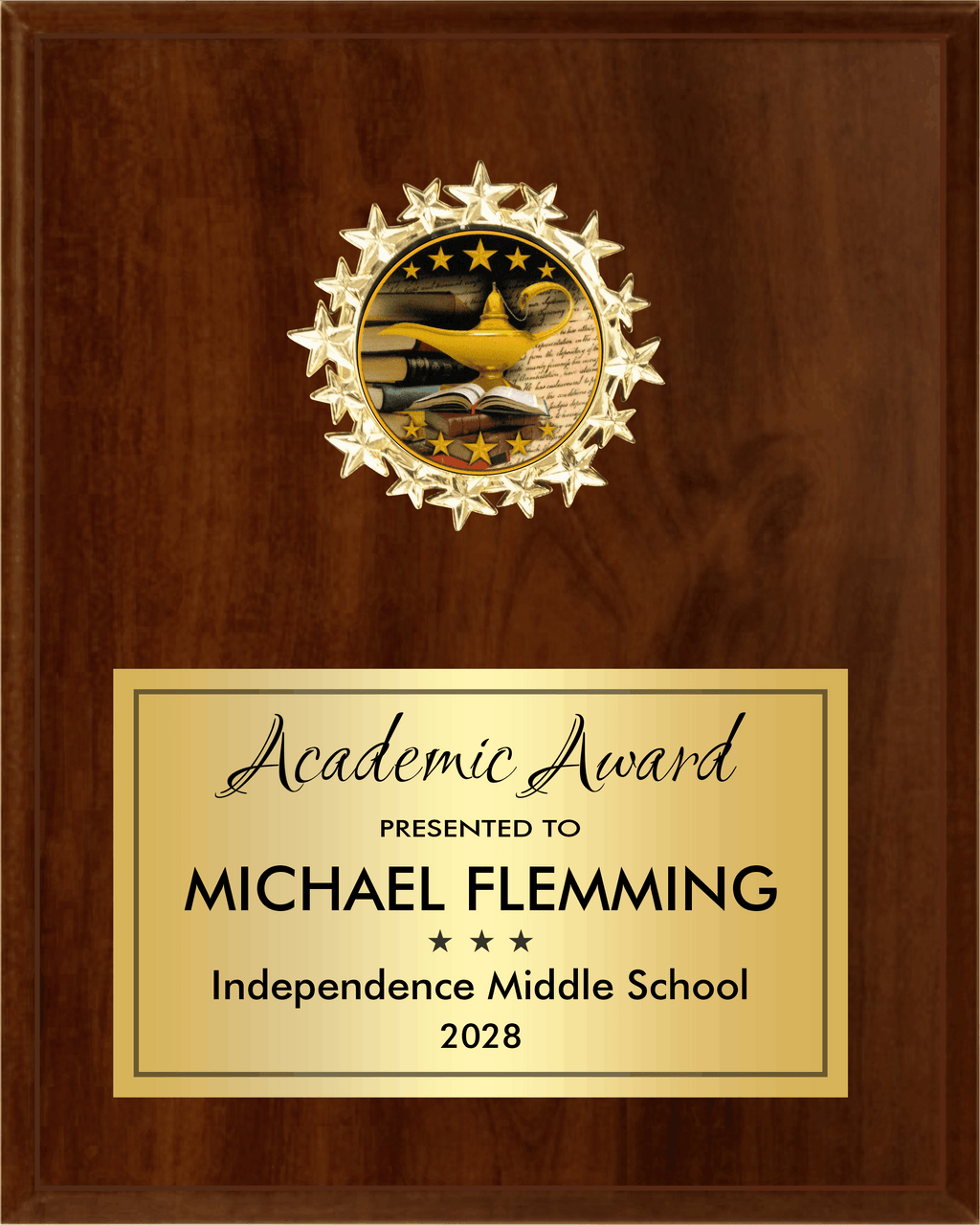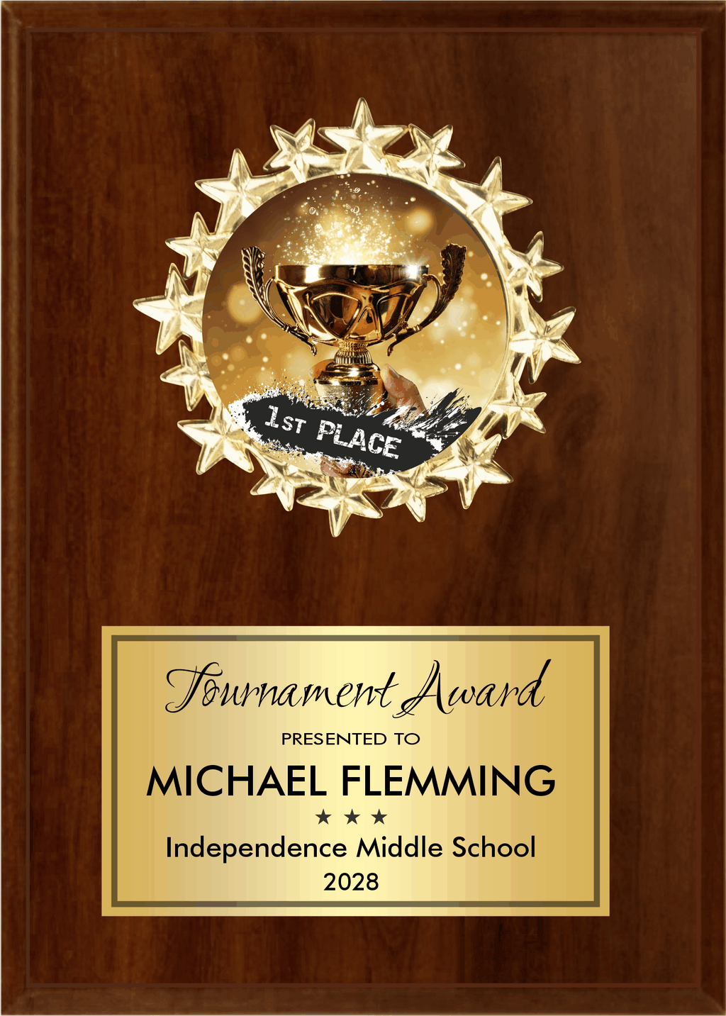 Highlight the shining stars on your team or organization with our Starburst Medallion Plaque. Customize with your logo or choose from a variety of stock designs. Made with an ebony or cherry finish, this plaque comes in 5 sizes and includes a personalization plate.