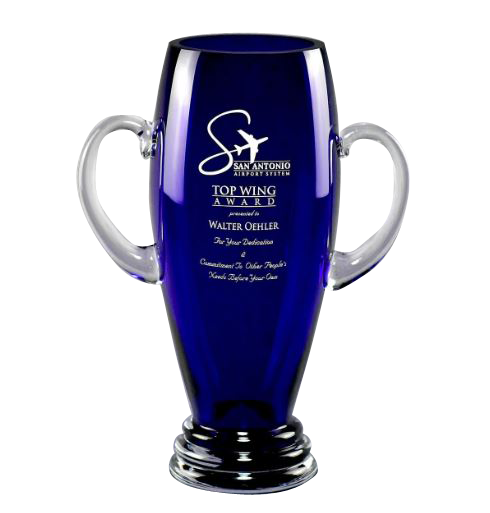 This cobalt blue oval vase with handles offers a large area to hold your logo and personalized text. Color filling in gold or silver is available to add impact to your personalized message. These vases work well in many settings including offices, country clubs, and homes. Fill them with flowers or your favorite beverage for an extra special touch when making the presentation to your special recipient. The handles offer the added benefit of drinking from this masterpiece in celebration of a championship win.